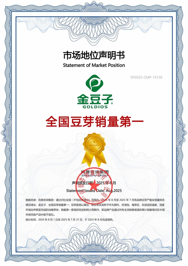 此次金豆子荣获尚普咨询【金豆子 全国豆芽销量第一】证明,标志着其在我国豆芽行业中的重要地位及消费者的高度认可。
